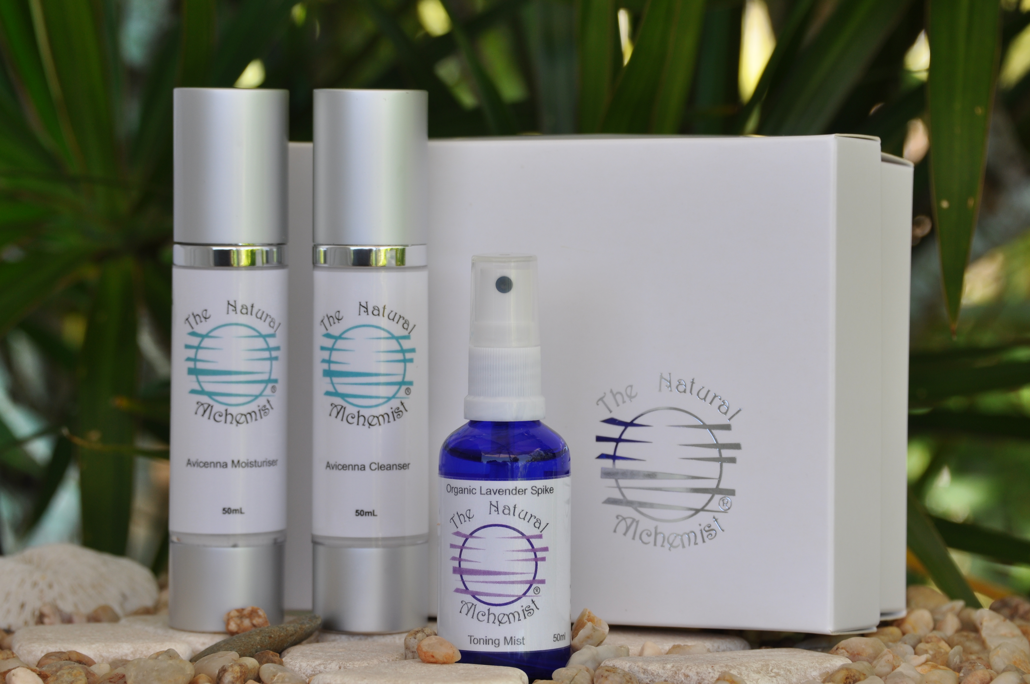 All these products containing only natural ingredients, Avicenna cleanser - Aqua(purified water), organic prunus amygdalus dulcis (sweet almond oil), organic coconut, coco-caprylate caprate (natural ester & coconut), glycerin (vegetable derived), xanthan gum, dermorganics 1388 ( glycerin,aqua, sodium levulinate, sodium anisate), tocopherol (vitamin e), castile soap and essential oils - Palmarosa, rosewood, organic lemongrass. Moisturiser - Aqua(purified water), organic prunus amygdalus dulcis (sweet almond oil), organic coconut, coco-caprylate caprate (natural ester & coconut), glycerin (vegetable derived), xanthan gum, cetearyl alcohol, cetearyl olivate (olive oil derived), dermorganics 1388 ( glycerin,aqua, sodium levulinate, sodium anisate), tocopherol (vitamin e) and essential oils - Rose, chamomile, sandalwood, ylang ylang. Toning mist - Organic lavender hydrosol These beautiful products are elegantly packaged in a matt white box with understated silver logo, suitable for male or female and conveniently ready for all gift occasions.